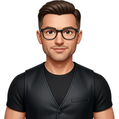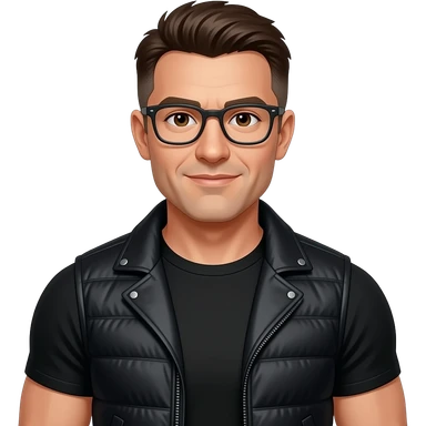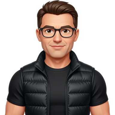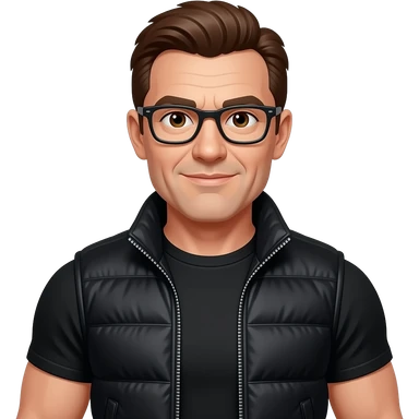Brown hair, 45 years old, glasses, black gilet, brown eyes, black round neck t shirt, sporty, muscular emoji