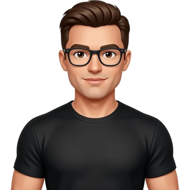 Brown hair, glasses, brown eyes, black round neck t shirt, sporty, muscular emoji
