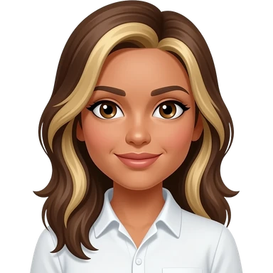 brown hair blond highlights, tan, side bang female with brown eyes with a white shirt emoji