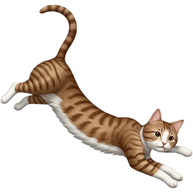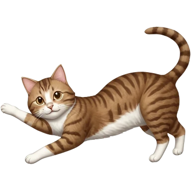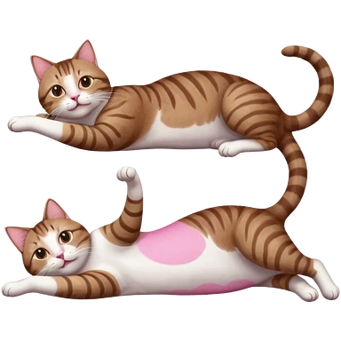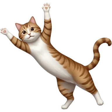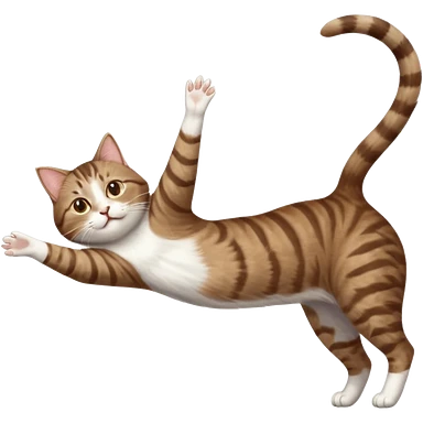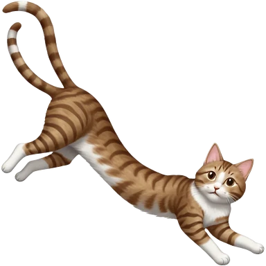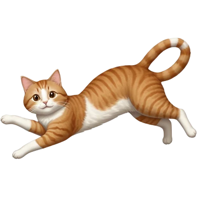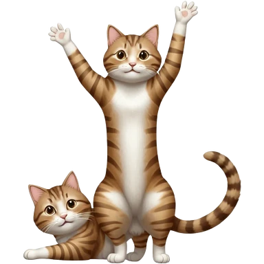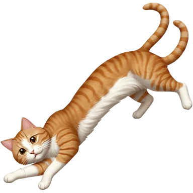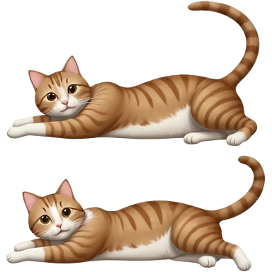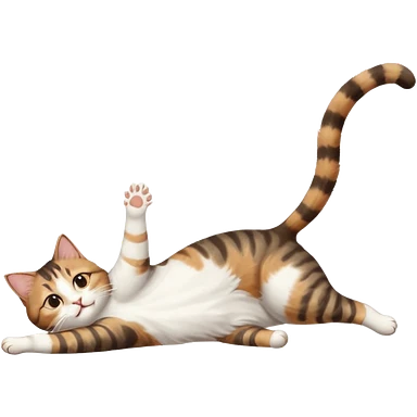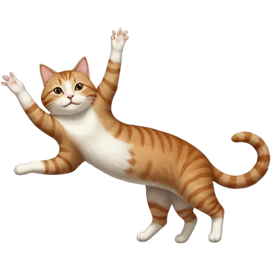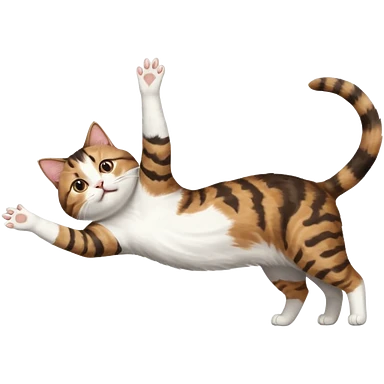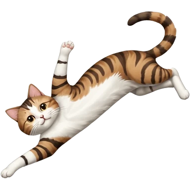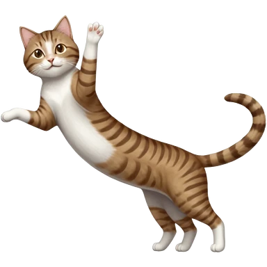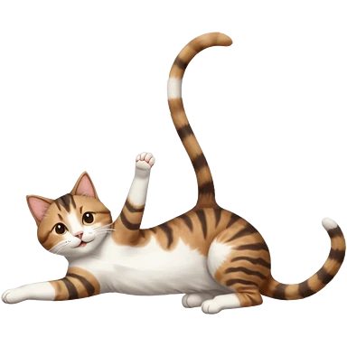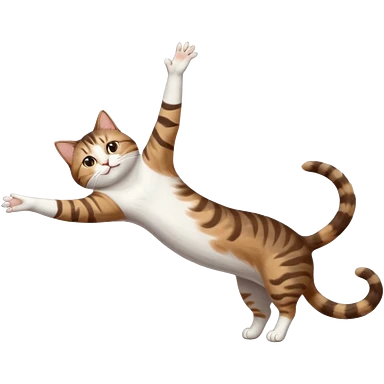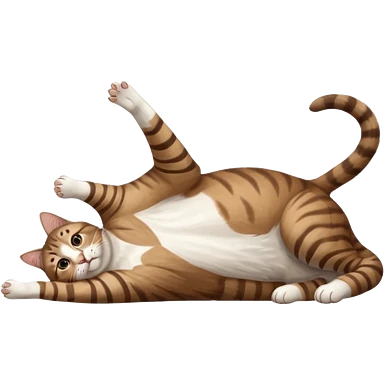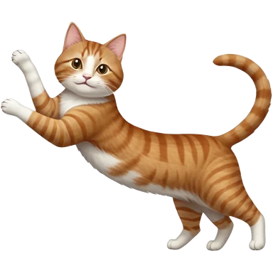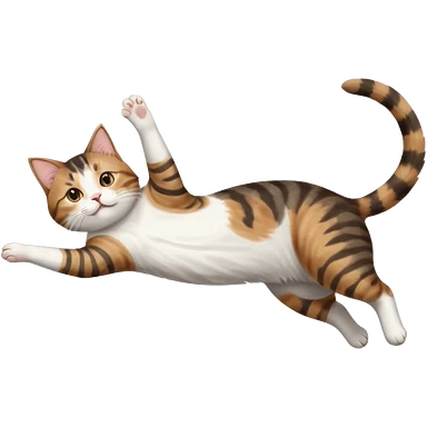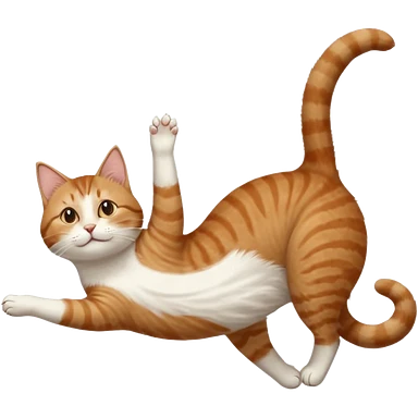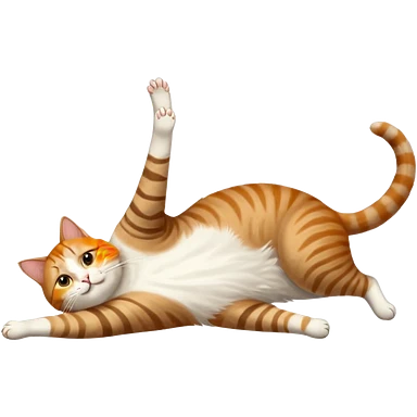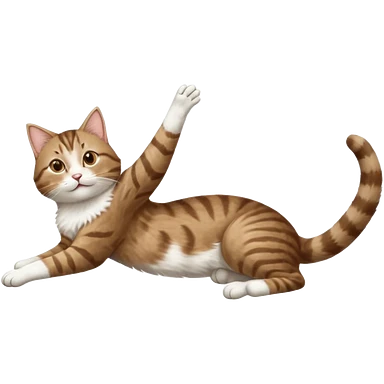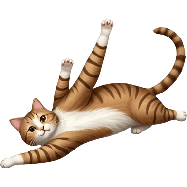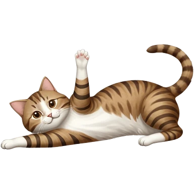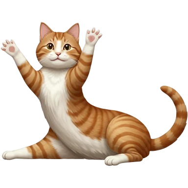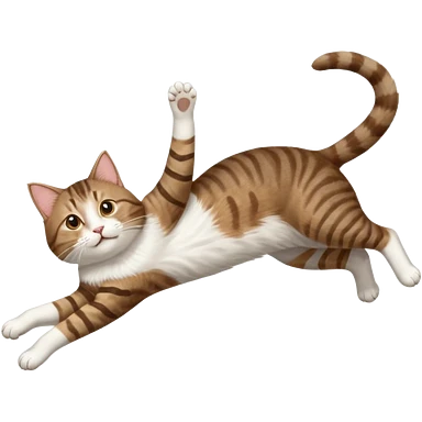 brown tabby and white cat with doing a big extremely long stretch reaching up into the air with arms and legs side by side together straight and overextended whilst lying on its side emoji