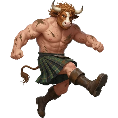 big buff curly hairy man covered in dirt with freckles with messy light brown bangs that covers his face completely with bull horns and bull ears and bull tail dressed in kilt jumped up kicking with his strong leg in boots with wind in his hair front view emoji