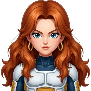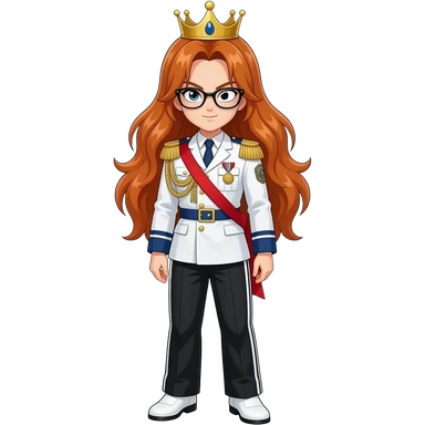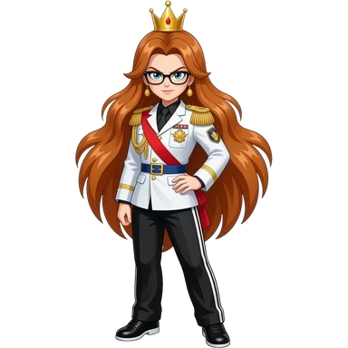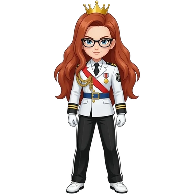 brown bushy auburn haired female android 21 and blonde shoulder length haired android 18 from dragon ball super are wear gold tiara black glass white military tunic arm badge shoulder cord medal red sash blue belt black trouser with two side stripes white shoes and become as evilness emoji | AI Emoji Generator