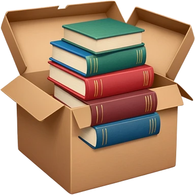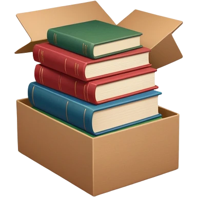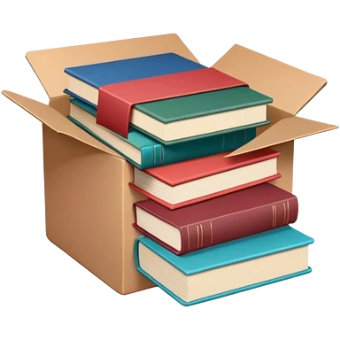 An open brown cardboard box with softly rounded edges, filled with a small stack of colorful hardcover books (muted red, blue, and green). emoji