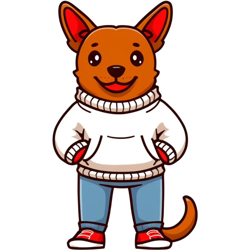 Brown dog standing upright with hands in jean pockets, wearing a white sweater and red shoes image | AI Emoji Generator