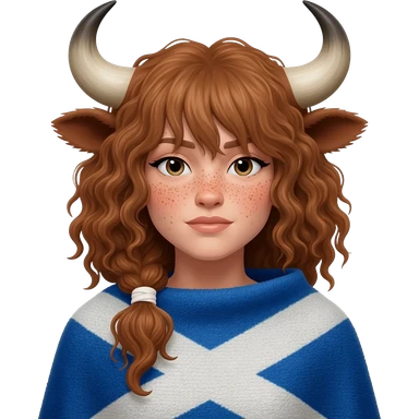 buff curly woman with freckles with messy light brown bangs covering the eyes with cow horns and cow brown ears with ribbon in her hair with body covered in Scottish flag like a blanket emoji