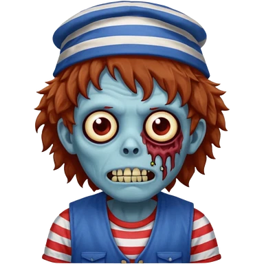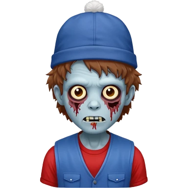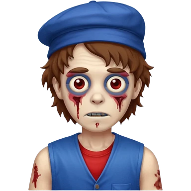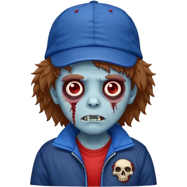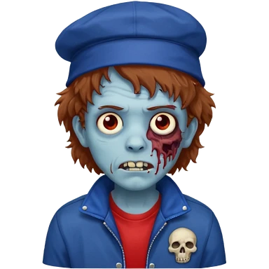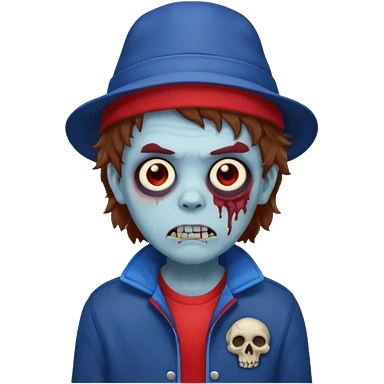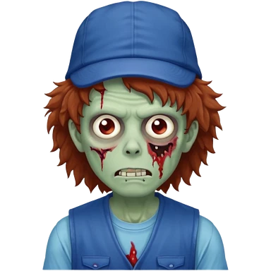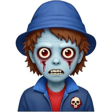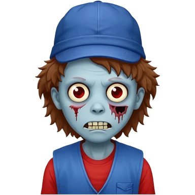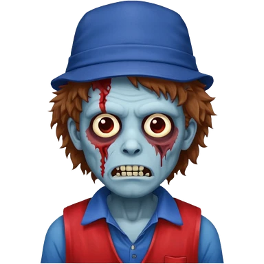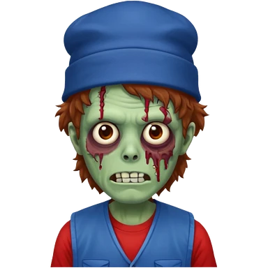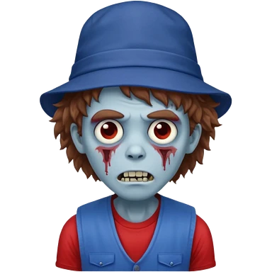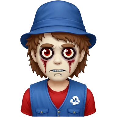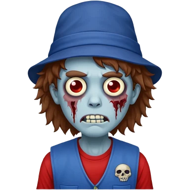 brown fluffy hair zombie with blue and white hat dark blue jilet red t shirt emoji | AI Emoji Generator