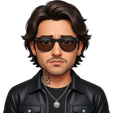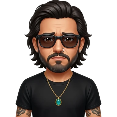 The handsome manly Latino podcast host with medium length hair, a long slightly graying beard and tattoos with his ears pierced 1 time each ear and a nose ring on the right side, dark brown eyes, wearing black, dark sunglasses, and jewelry, sad af emoji