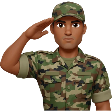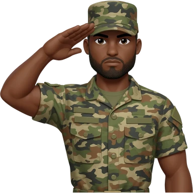 A black military soldier, brown skinned and camouflage uniform to include the hat saluting with the right arm, make the soldiers serious and make the built of the soldier muscular emoji