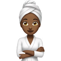 A girl having a spa day with a robe and a towel on her head with a green face mask emoji