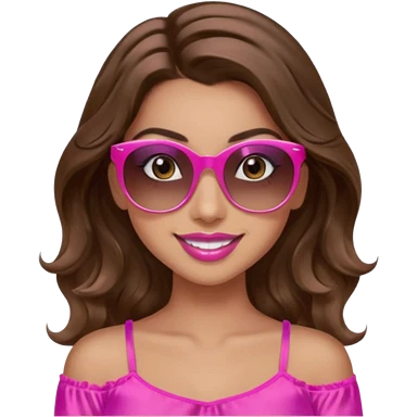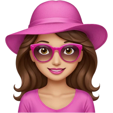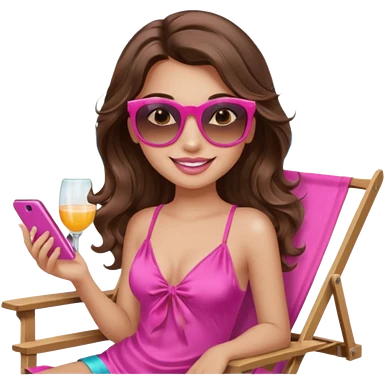 girl with long wavy brown hair, brown eyes, long lashes makeup, sexy pink lips, smiling, light to medium complexion, wearing a pink sexy silk top, relaxing in a beach chair, wearing black sunglasses, holding a drink emoji