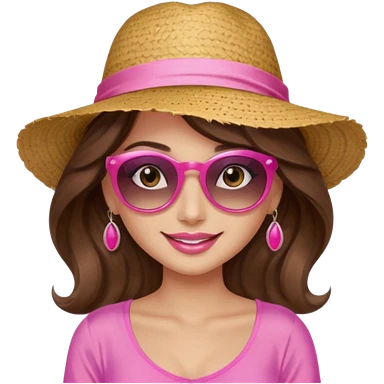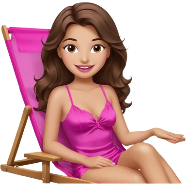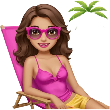 girl with long wavy brown hair, brown eyes, long lashes makeup, sexy pink lips, smiling, light to medium complexion, wearing a pink sexy silk top, relaxing in a beach chair emoji