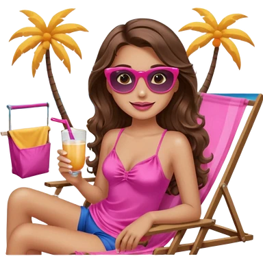 girl with long wavy brown hair, brown eyes, long lashes makeup, sexy pink lips, smiling, light to medium complexion, wearing a pink sexy silk top, relaxing in a beach chair, wearing black sunglasses, holding a drink, palm trees emoji