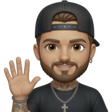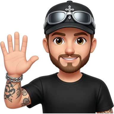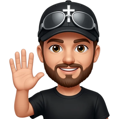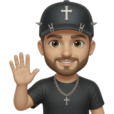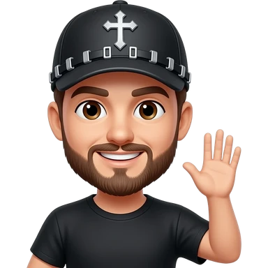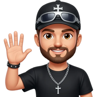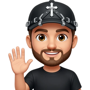 Brown eyes, rock-style cap with metallic clips on the cap visor , rock cross on the cap , black teeshirt, saying hi, no tattoo , no chain, short hair , brown beard, no withstand, saying hi with hand emoji