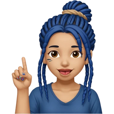 light brown girl with dark blue dreads in a bun with tongue out giving middle finger emoji
