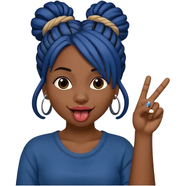 brown girl with dark blue dreads all in a bun with tongue out giving middle finger emoji