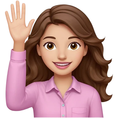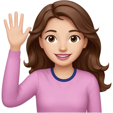 Girl with brown and long hair smiling kindly and waving with the right hand emoji