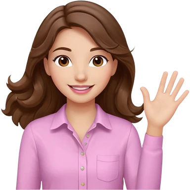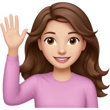 Girl with brown, long and straight hair smiling kindly and waving with the left hand emoji