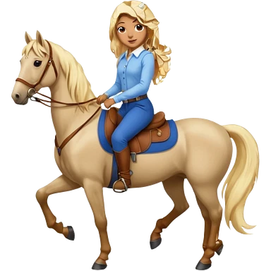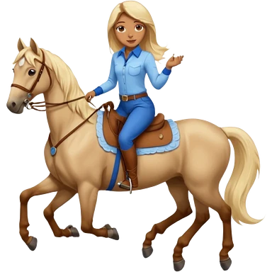 Brown girl with very long blonde/gold hair that’s blowing in the wind wearing a cream colored collared long sleeve shirt and jeans with brown boots on top of a brown horse with 4 legs emoji | AI Emoji Generator