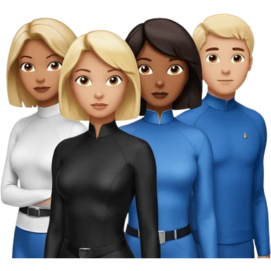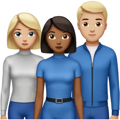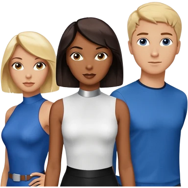 3 Friends standing side by side, charlie's angels style: 1 black woman with a short flat pressed bob, 1 hispanic man with a thin nose and long hair, and 1 white guy with blue eyes and a short brown-blonde haircut emoji