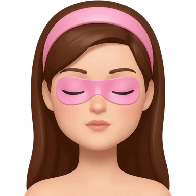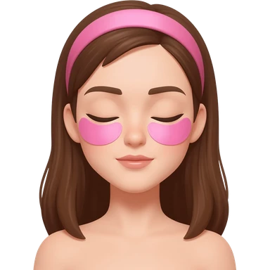 Brown hair woman, eyes closed, calm, headband, pink eye patches, glossy skin, 3D emoji style, white background emoji