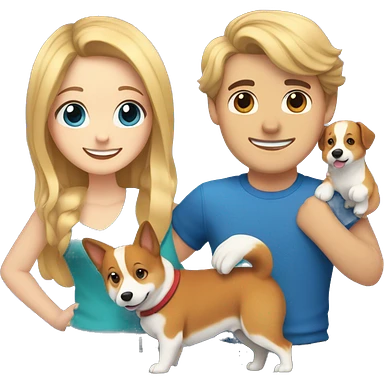 A girl with long blond hair and brown eyes, a guy with blond, slightly curly hair and blue eyes, hugging and a dog corgi between them emoji