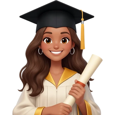 school graduation with a pretty female graduating student with long brown hair, brown eyes, big earrings and brown tan emoji