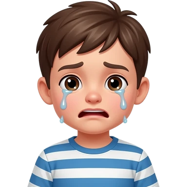 brown haired boy child with a srtipped blue white shirt crying emoji