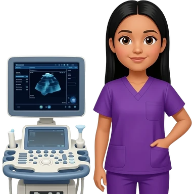 A sonographer with purple scrubs black long straight hair, brown eyes, light skin standing next to an ultrasound machine emoji