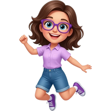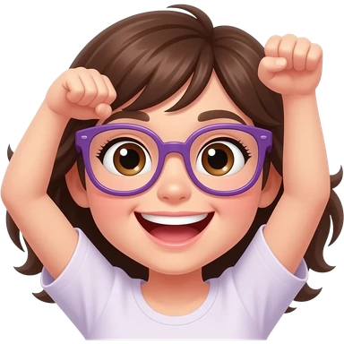 brown haired girl with purple glasses and brown eyes jumping for joy emoji