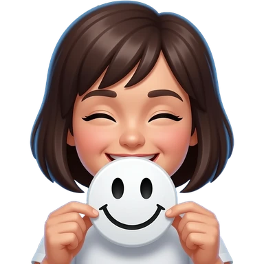 “Apple-style emoji of a brown-haired person holding a white smiley-face disc over their mouth, soft glow, dark neon background, smooth gradients, minimal detail emoji