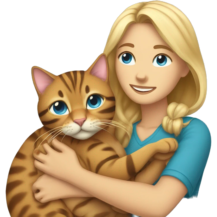 a beautiful girl with brown hair and blue eyes holds a Bengal cat in her arms emoji