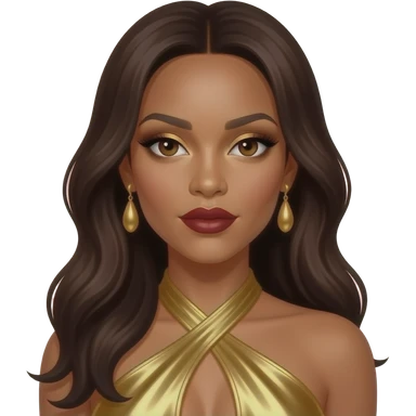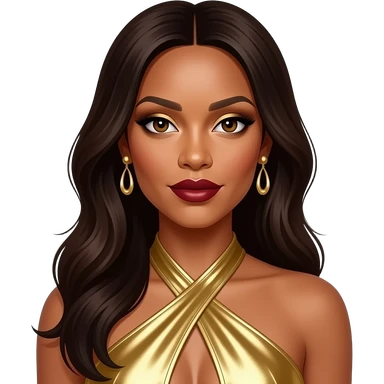 Kelly Rowland from Destiny's Child with dark brown eyes, long black hair, gold eyeshadow, dark red lipstick, gold metallic halter dress, gold earrings emoji