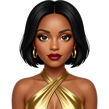 Kelly Rowland from Destiny's Child with dark brown eyes, short black hair, gold eyeshadow, dark red lipstick, gold metallic halter dress, gold earrings emoji
