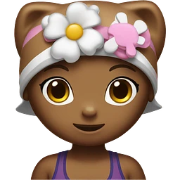 Brown skinned hello kitty face, black oval eyes, yellow circular nose, round face with no mouth, replace her red bow with a pink hibiscus flower emoji