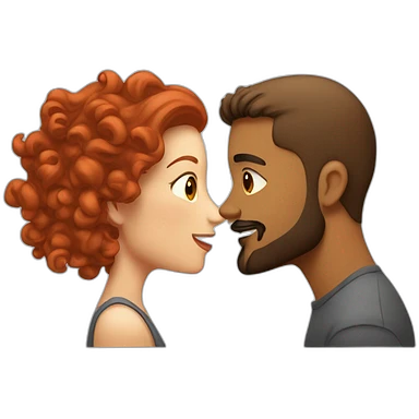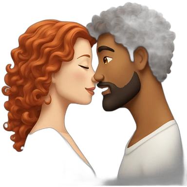 Brown man with a smooth hair cut fade and a beard kissing a White woman with long red curly hair emoji