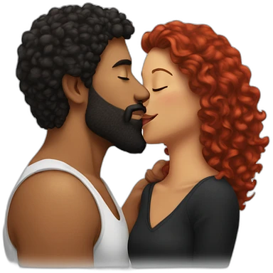 Brown man with a smooth black hair cut fade and a black beard kissing a White woman with long red curly hair emoji