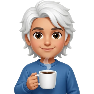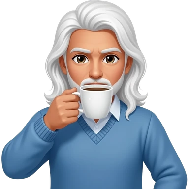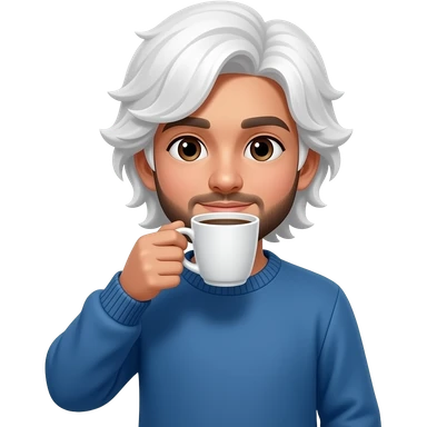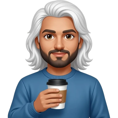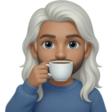 Pakistani guy with long white hair drinking coffee, wearing blue sweater, no facial hair - bare face emoji