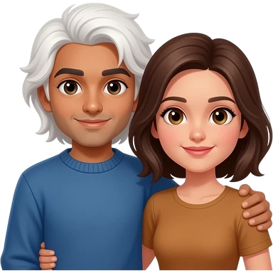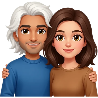 Brown Pakistani boy with no facial hair, long white shoulder-length hair, wearing a blue sweater, holding a tan-toned young woman with almond shaped hazel eyes and shoulder-length brown hair emoji