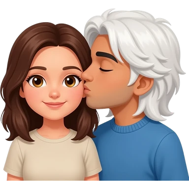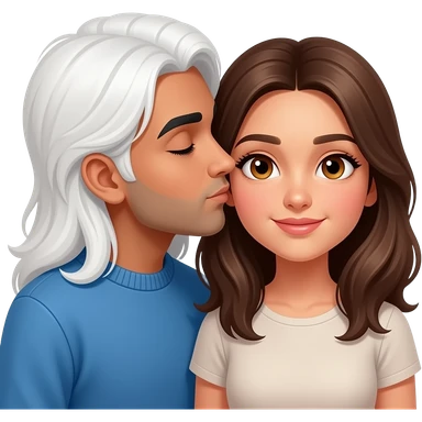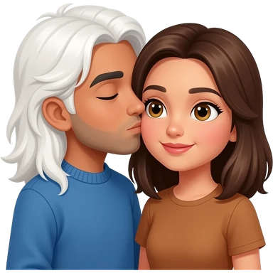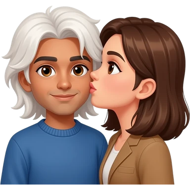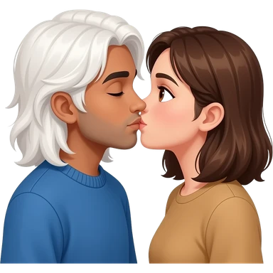 Brown Pakistani boy with no facial hair, long white shoulder-length hair, wearing a blue sweater, kissing an tan-toned young woman with almond shaped hazel eyes and shoulder-length brown hair emoji