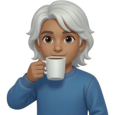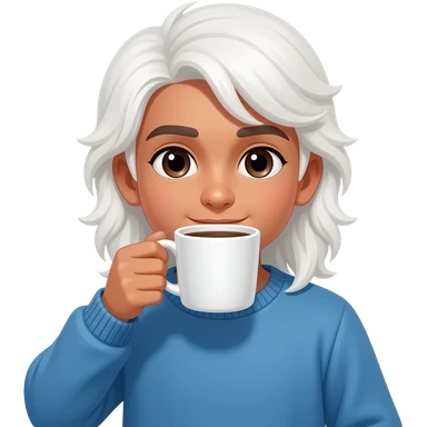 Mild Brown Pakistani boy with long white hair drinking coffee, wearing blue sweater, no facial hair - bare face emoji