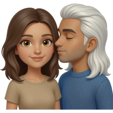 Brown Pakistani man with no facial hair, long white shoulder-length hair, wearing a blue sweater, kissing an olive-skinned girl with hazel eyes and shoulder-length brown hair emoji | AI Emoji Generator