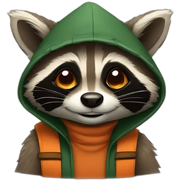 brown raccoon with orange eyes and a dark green hood that is smiling emoji