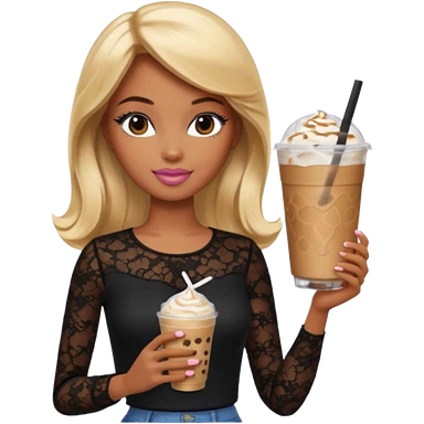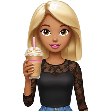 brown skin blonde barbie wearing black lace shirt with iced latte with long French tip nails emoji | AI Emoji Generator