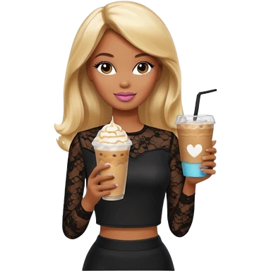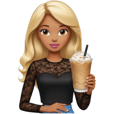 brown skin blonde barbie wearing black lace shirt with iced latte emoji