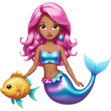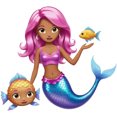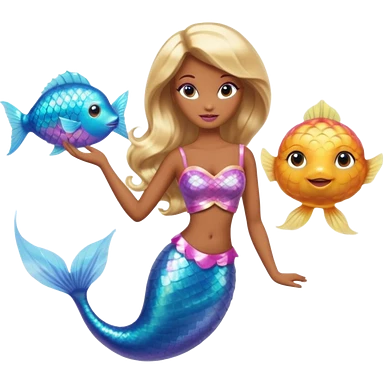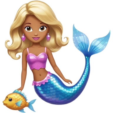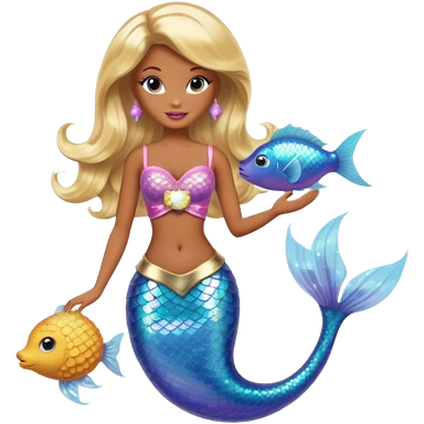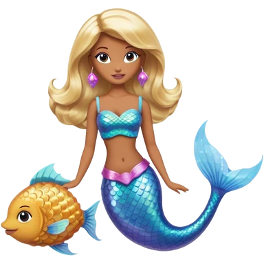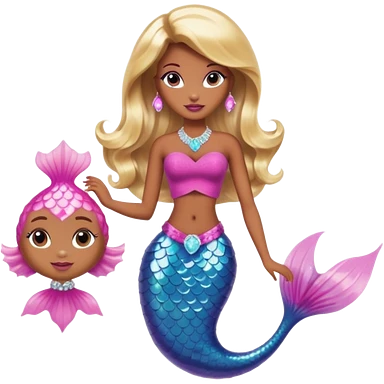 Brown skin blonde hair barbie mermaid with glitter tail with pufferfish emoji | AI Emoji Generator