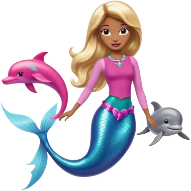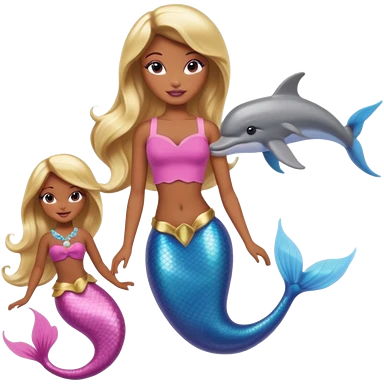 Brown skin blonde hair barbie mermaid with pink tail and dolphin emoji