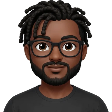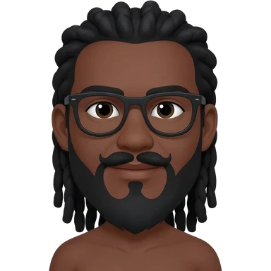African American dark brown skin man with shoulder length black dreadlocks in on a braided hair style wearing black glasses with black moustache and beard separated with slightly chubby face emoji