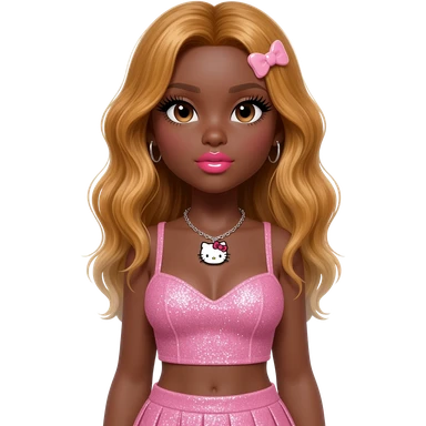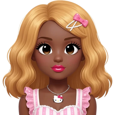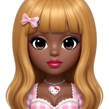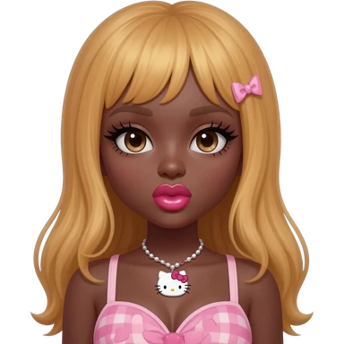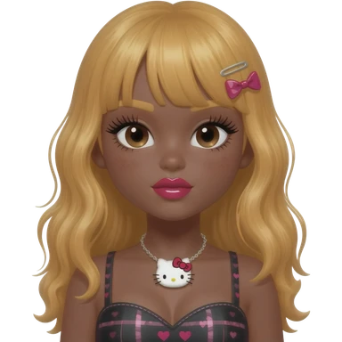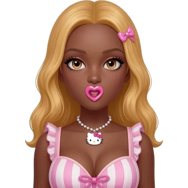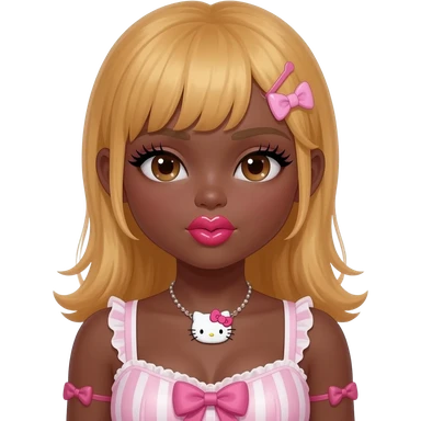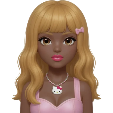 heart shaped lips, cute glossy lips, doll eyes with long lashes, dark brown skin, honey blonde hair, big chest, hello kitty necklace, one bow clip, bimbocore outfit emoji