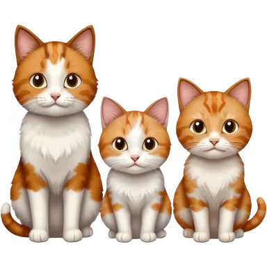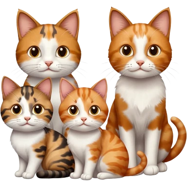 3 different coloured small cats including a brown tabby and white, a patchy calico, and a ginger and white emoji