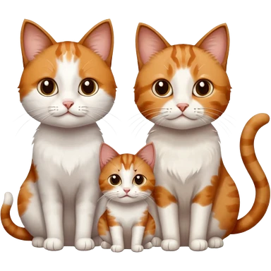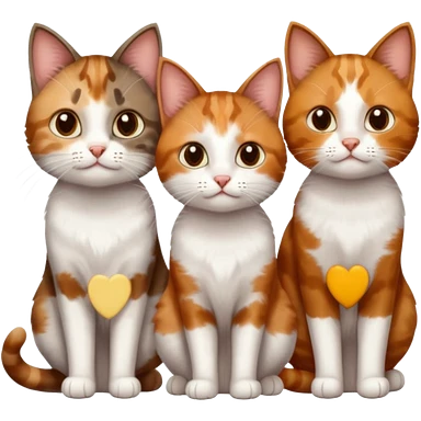3 small cats different colours including brown tabby and white, patchy calico, and ginger and white emoji